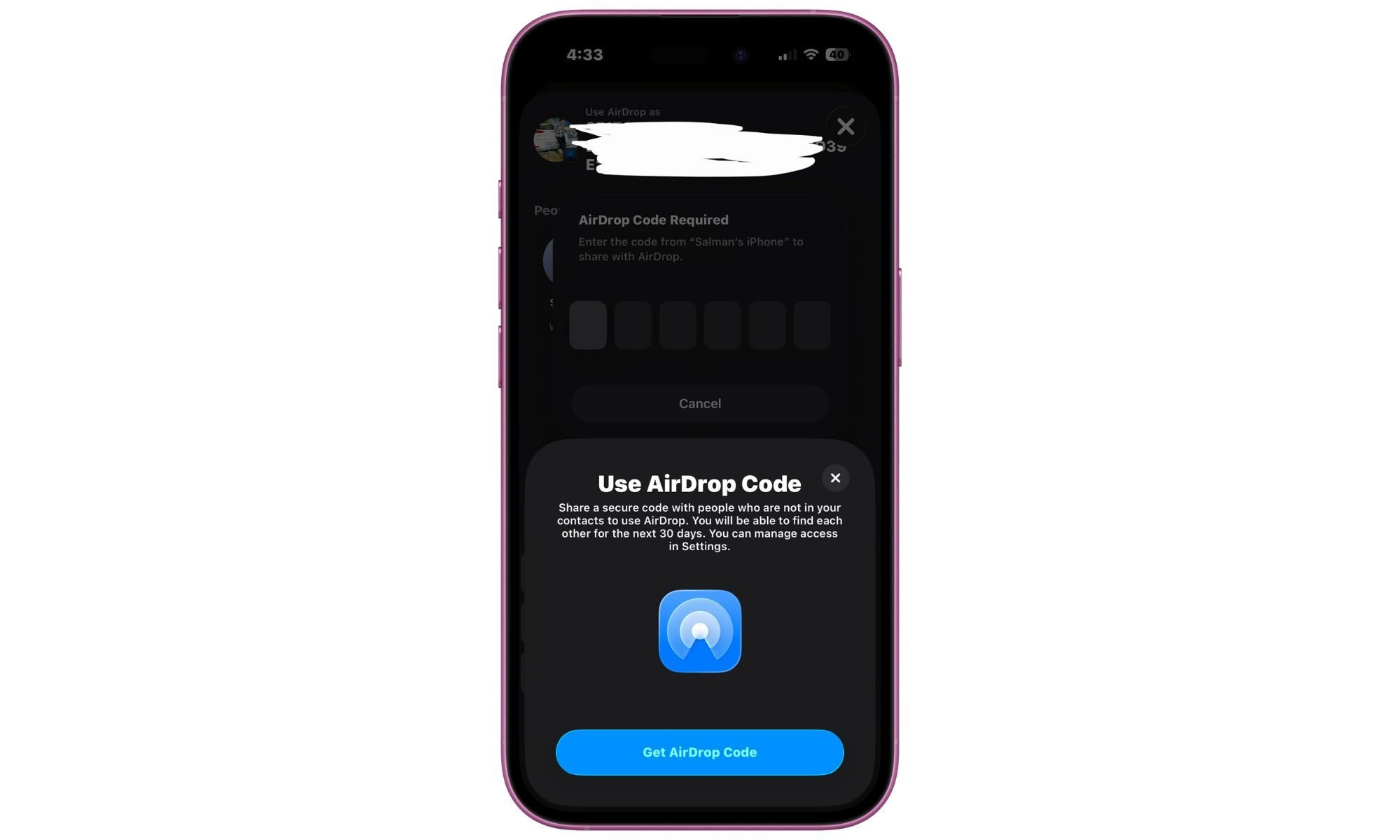 Talep: Tanımadığınız bir iPhone kullanıcısı size dosya göndermek istediğinde, "AirDrop Kodu Al" seçeneği beliriyor.