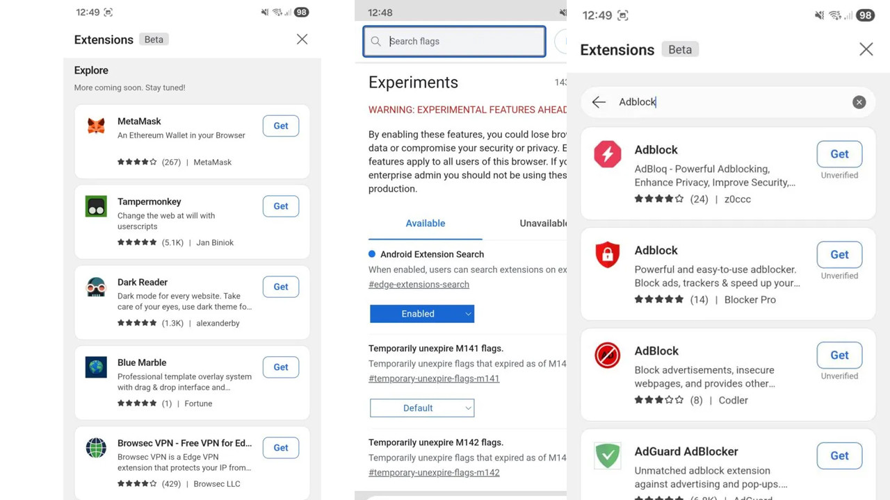 Androidauthority'de yer alan habere Microsoft Edge’in Android beta (sürüm 143) sürümü, tarayıcı içinden uzantı aramasını açan gizli bir bayrakla (flag) geliyor.