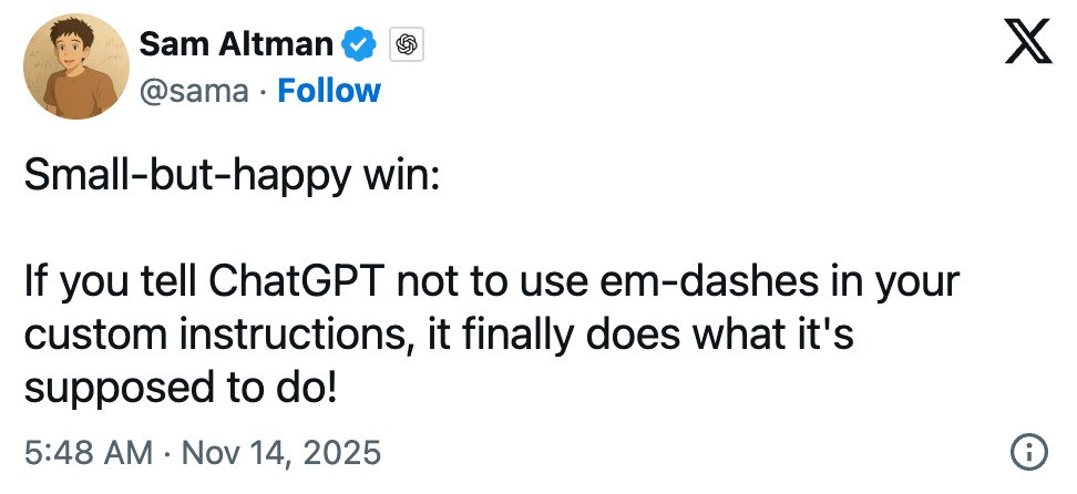 Şirket, kullanıcıların ChatGPT’ye “tire kullanma” talimatını özel yönergeler bölümünden tanımlayarak, modelin bu noktalama işaretini otomatik eklemesini engelleyebileceğini duyurdu. Öte yandan OpenAI CEO Sam Altman, X’te bunun “küçük ama hoş bir gelişme” olduğunu söyledi.